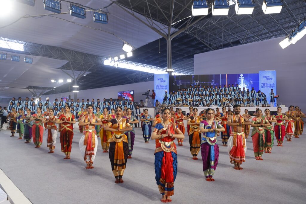 तत्पूर्वी, समागम स्थळी आगमन होताच समागमात उपस्थित समस्त मानव परिवाराच्या वतीने सतगुरु माता सुदीक्षाजी महाराज आणि आदरणीय निरंकारी राजपिता रमितजी यांचे स्वागत संत निरंकारी मंडळाच्या कार्यकारिणीतील वरिष्ठ सदस्यांकडून पुष्पहार व पुष्पगुच्छ देऊन करण्यात आले. त्यानंतर या दिव्य जोडीला फुलांच्या सजावटीने सुशोभित खुल्या पालखीमध्ये विराजमान करून समागम पंडालच्या मध्यभागातून मुख्य मंचापर्यंत एका भव्य शोभायात्रेच्या रूपात नेण्यात आले. मुख्य मंचाजवळ पोहोचताच, संत निरंकारी इन्स्टिट्यूट ऑफ म्युझिक अँड आर्ट्सच्या 2500 हून अधिक विद्याथ्र्यांकडून भरत नाट्यम नृत्याद्वारे स्वागत गीताचे गायन करण्यात आले. ते दृश्य अत्यंत विलोभनीय होते.