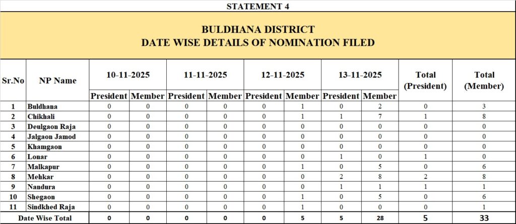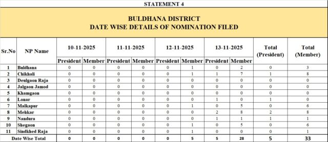 बुलढाणा, दि. 13 (जिमाका): राज्य निवडणूक आयोगाने नगरपरिषद व नगरपंचायतींच्या सदस्य व अध्यक्ष पदांसाठी सार्वत्रिक निवडणूक कार्यक्रम जाहीर केला आहे. कार्यक्रमानुसार दि. 10 नोव्हेंबर 2025 पासून नामनिर्देशपत्र दाखल करणे सुरु झाले असून आतापर्यंत नगरपरिषद अध्यक्ष पदासाठी 5 तर सदस्यांसाठी 33 नामनिर्देशन पत्र दाखल केले आहे.